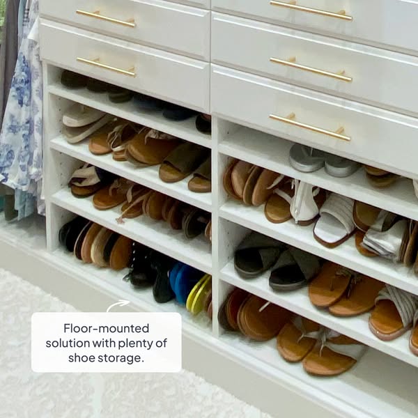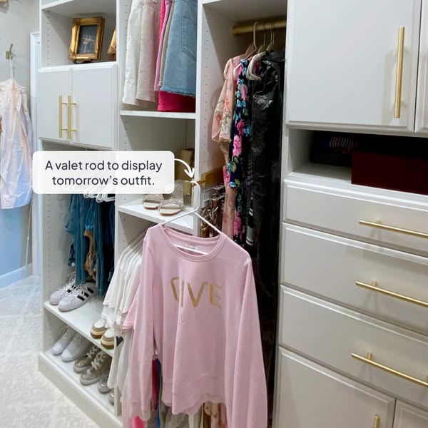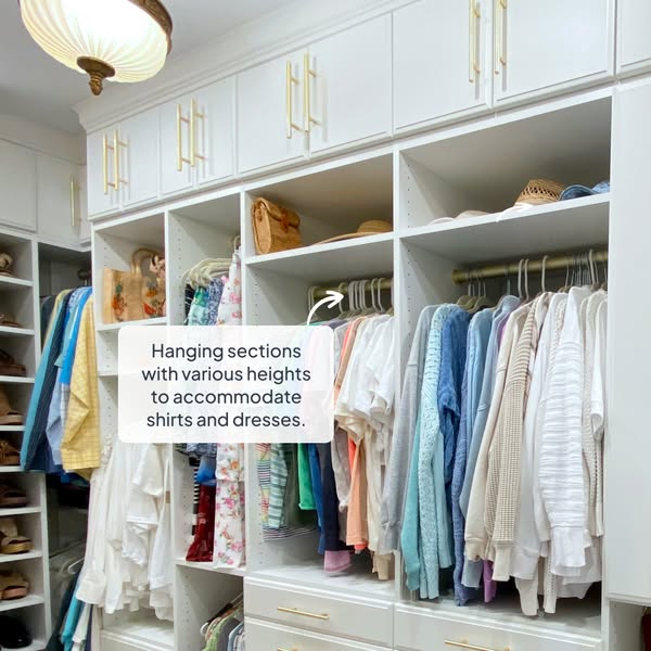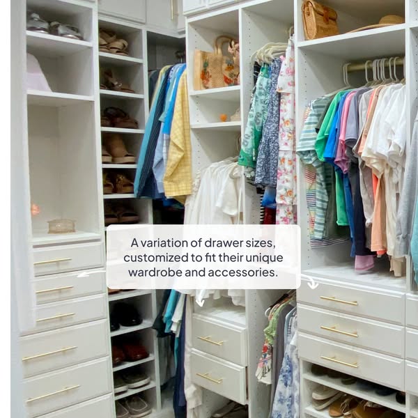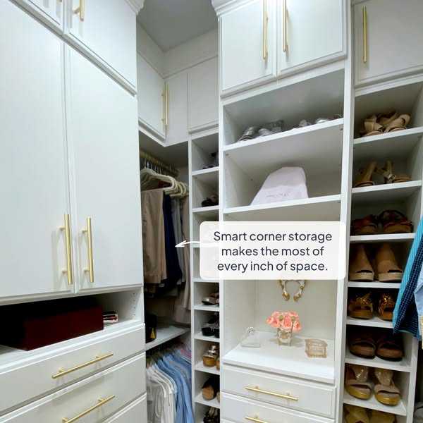 Step inside this dreamy walk-in closet, featuring custom floor-to-ceiling storage, a bright white finish, and matte brass hardware that adds a touch of elegance. ✨