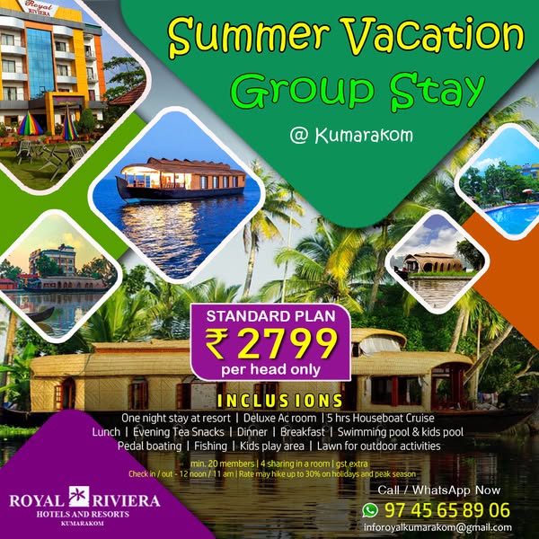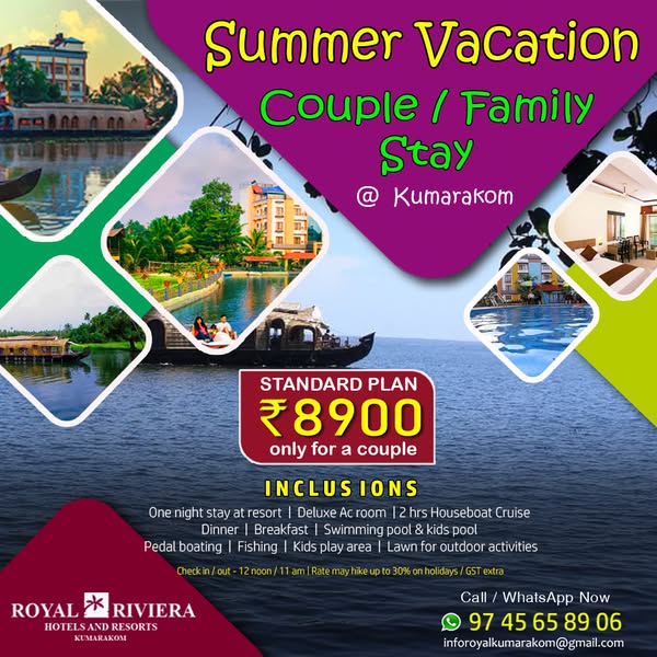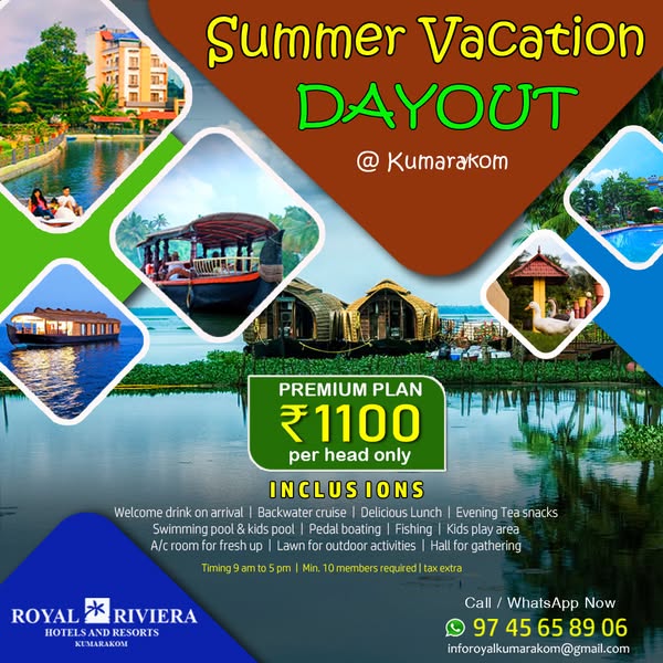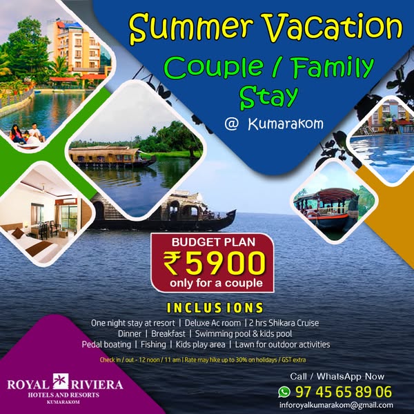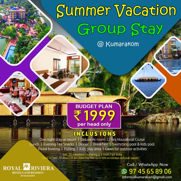 搜索关键词 Kumarakom Kerala holidays, Royal Riviera Resort, Kerala houseboat stay, Kerala family packages, Kerala group tours, Kerala resort deals, Kumarakom travel packages, Kerala vacation offers, Indian tourism packages, Backwater holiday packages优势 Scenic location in Kumarakom, Kerala,Variety of packages: Dayout, Resort & Houseboat Stay,Suitable for Couples, Families & Groups
