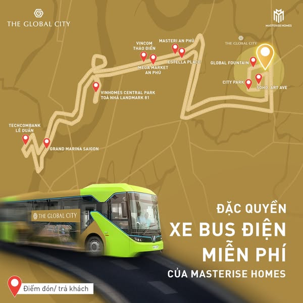 The Global City provides free electric buses - TGC01 stopping at Techcombank Lê Duẩn (Dist. 1) - Grand Marina Saigon (Dist. 1) - Landmark 81 (Bình Thạnh Dist.) – Metro station (Dist. 2) and go to The Global City.