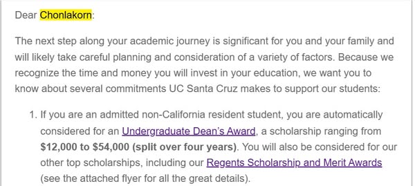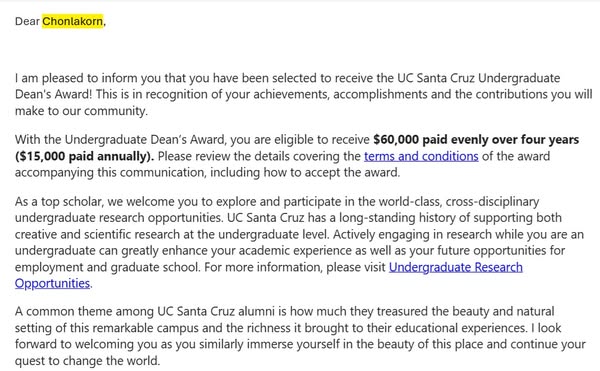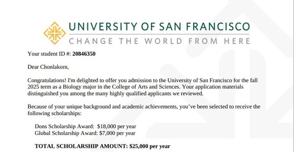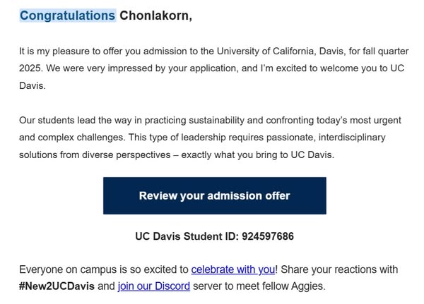 ขอแสดงความยินดีอย่างยิ่ง สำหรับการได้รับคัดเลือกให้เข้าศึกษาต่อในมหาวิทยาลัยอันดับ 1 ของโลก ด้านสัตวแพทย์ (The world’s top 1 university for veterinary medicine!) University of California, Davis นอกจากนี้ นางสาว ชลกร รัตนวงศ์ ยังได้รับการคัดเลือกและสอบสัมภาษณ์ พร้อมทั้งรับทุนการศึกษาตลอดหลักสูตรดังนี้ University of California, Santa Cruz ได้รับทุนการศึกษา 2,100,000 บาท University of Sanfrancisco 3,500,000 บาท University of California, Riverside University of California , Merced จุฬาลงกรณ์มหาวิทยาลัย และ สถาบันเทคโนโลยีพระจอมเกล้าเจ้าคุณทหารลาดกระบัง