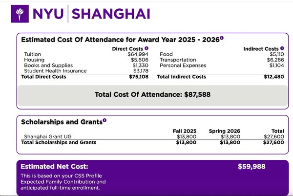 • New York University – Shanghai: Học bổng 27,000 USD/năm – Còn lại: 60,000 USD/năm