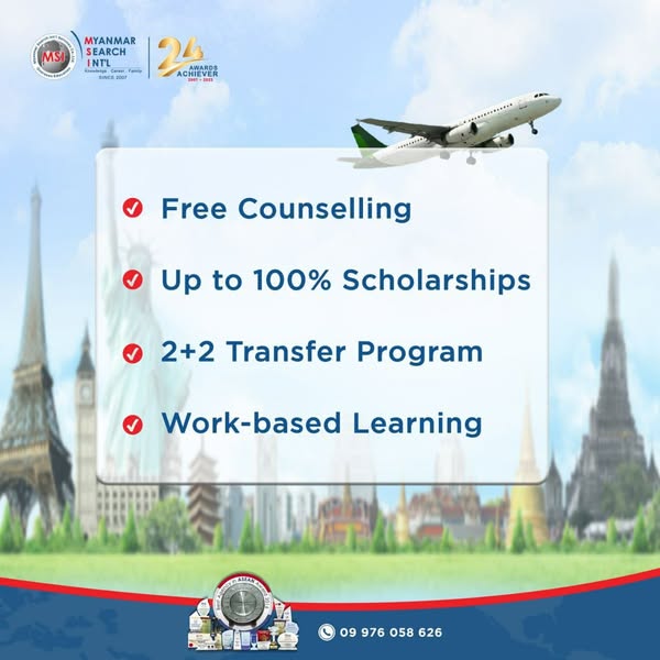 နိုင်ငံခြားမှာ ပညာသင်ကြားဖို့ စဉ်းစားထားသူတွေကလည်း နောက်နှစ် 2025 မှာ အနာဂတ်ပညာရေးအတွက်𝑷𝒍𝒂𝒏 ချသင့်တဲ့ အချိန်ဖြစ်တာကြောင့် 𝗠𝗦𝗜 အနေနဲ့ မြန်မာနိုင်ငံက ကျောင်းသား၊ကျောင်းသူတွေရဲ့ နိုင်ငံခြားပညာရေးအိပ်မက်ကို တစ်ဖက်တစ်လှမ်းကအကောင်အထည်ဖော်ပေးချင်ပါတယ်။