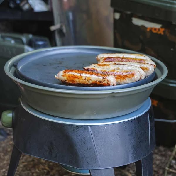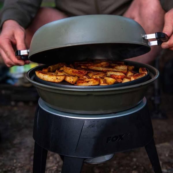 搜索关键词 fox cookware, camping stove, fishing cookware, portable stove, non stick grill, outdoor cooking set, gas camping cooker, folding camping stove, camping gas stove, Ribolovni pribor优势 Complete gas cooking solution,Standard stove configuration,Solid, flat non-stick baking plate,Non-stick grill grate,Non-stick lid usable as large pan/wok,Lid usable for oven creation,Compact foldable design