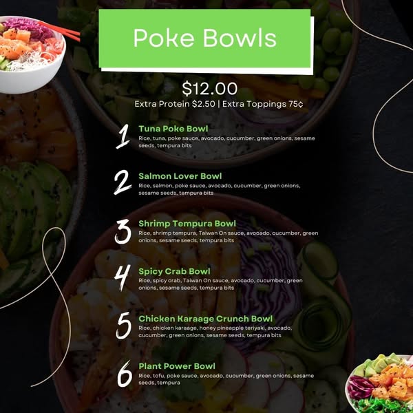 搜索关键词 Poke bowls, New menu, Restaurant promotion, Delicious food, Fresh ingredients, JC restaurant, Taiwan on JC, Sushi last chance, December 10th, Limited Time Offer优势 Fresh Ingredients,Delicious Flavors,New Menu Items
