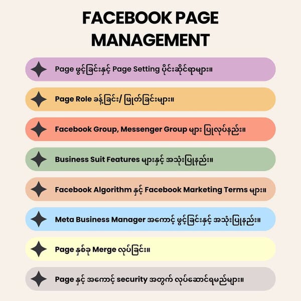 1️⃣ Page တစ်ခုကို ဆရာကျကျ ကိုင်နိုင်ဖို့ Facebook Page, Group, Meta Business Suit, Business Manager အသုံးပြုတဲ့အပိုင်း အစရှိတဲ့ Page နဲ့ ပတ်သက်တဲ့အပိုင်းတွေအကုန်လုံးကို အသေးစိတ် ပြောပြပေးထားပါတယ်။