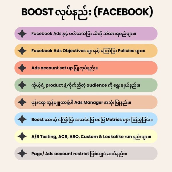 2️⃣ Facebook Ads Manager ကို ဖုန်းရော ကွန်ပျူတာကနေပါ ကျွမ်းကျွမ်းကျင်ကျင် အသုံးပြုပြီး ထိရောက်စွာ Boost လုပ်နိုင်အောင် basic to advanced ကို သင်ကြားပေးထားပါတယ်။