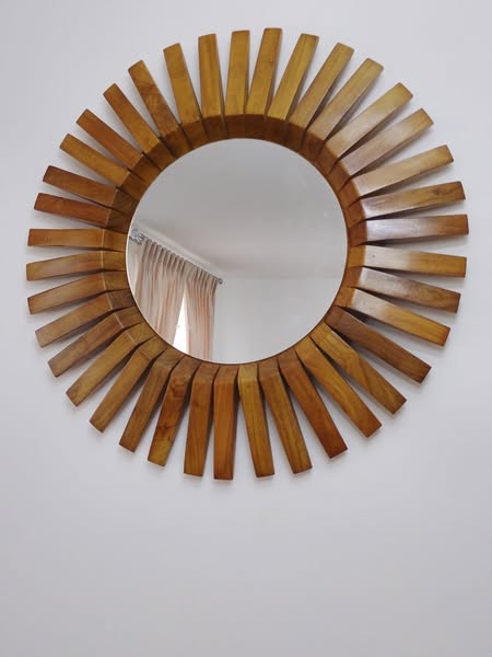 We present to you our Wall-Hanging Decorative Sunburst Mirror, beautifully handcrafted from solid Wanza wood.