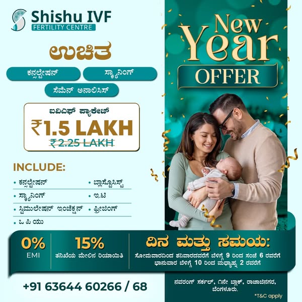 ಶಿಶು IVF ಫರ್ಟಿಲಿಟಿ ಸೆಂಟರ್ನಲ್ಲಿ ₹1.5 ಲಕ್ಷಗೆ ಐವಿಎಫ್, ಕನ್ಸಲೇಷನ್, ಬ್ಲಾಸೊಸಿಸ್ಟ್ ಟ್ರಾನ್ಸ್ಫರ್, ಸ್ಟಿಮುಲೇಷನ್ ಮತ್ತು ಫ್ರೀಜಿಂಗ್ ಸೇವೆಗಳು.
