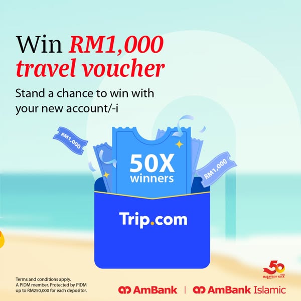 搜索关键词 AmBank account, new account opening, cash rebate, travel voucher, online banking, referral program, AmOnline App, Malaysia banking优势 RM8 cash rebate for new account opening,Chance to win RM1,000 Trip.com travel voucher,Up to RM50 cash rebate for referrals,Convenient online account opening via AmOnline App,PIDM protection up to RM250,000