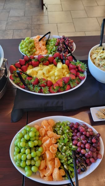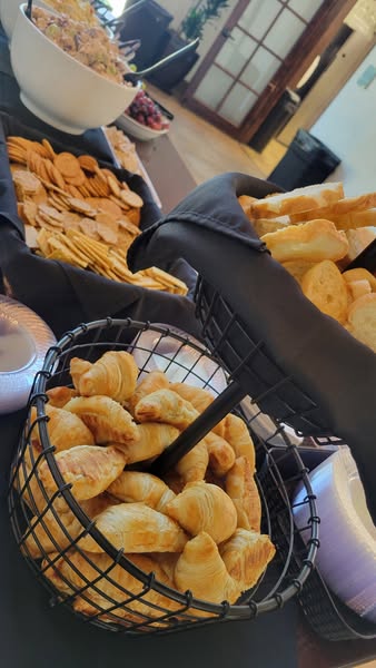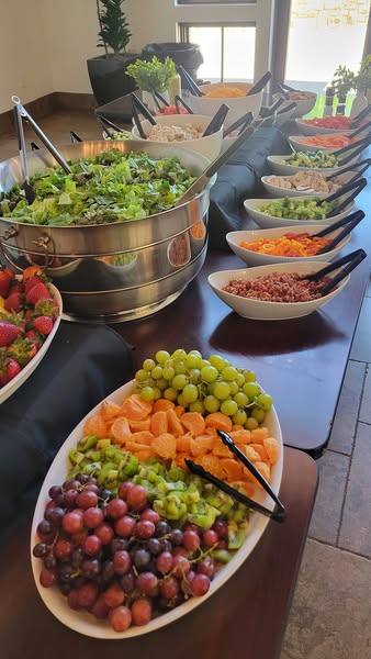 They chose our chicken salad, pasta salad, seasonal fruit bar of fresh strawberries, pineapple, grapes, kiwi and oranges, along with a garden salad with tons of toppings to choose from like chicken, ham, bacon, cheese, tomatoes, walnuts, red onion, croutons, fried onions, mushrooms, cucumber, broccoli, carrots, and bell peppers. Along with crackers, crostini's and croissants.
