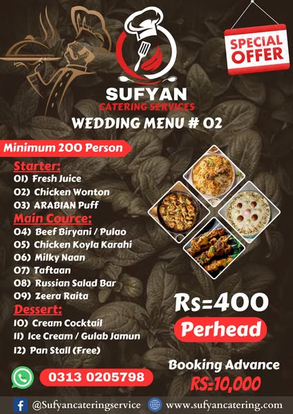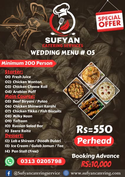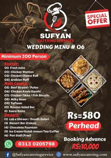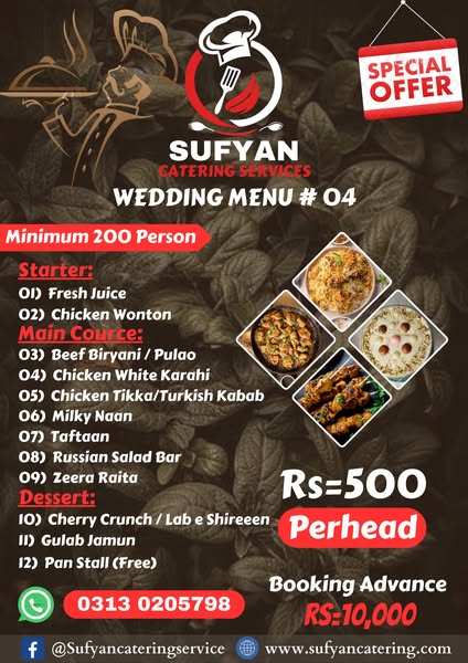 搜索关键词 sufyan catering services, wedding food karachi, affordable wedding menu, valima food menu, karachi catering service, event catering solutions, delicious wedding food, book catering now, wedding culinary excellence, affordable catering elegance优势 New, hot, tasty, and affordable menus.,Booking available for multiple months.,Food tasting available before ordering.,Per head or in Kgs food making facility.,Service available all over Karachi.