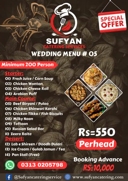 搜索关键词 wedding catering services, karachi food, affordable wedding menu, catering solutions, Karachi wedding food, tasty food menu, exceptional service, book now, culinary excellence, Sufyan Catering Services优势 New and tasty food menus,Affordable prices,Food tasting before order,Per head and Kg based options,Service available all over Karachi
