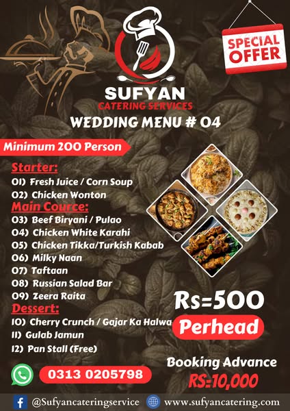 Sufyan Catering Services bring Some New, Hot, Tasty & Affordable Wedding / Valima Food Menus for our Valued Customers.