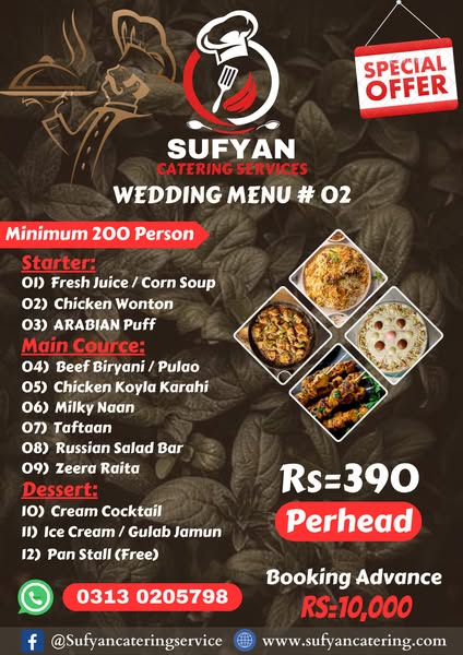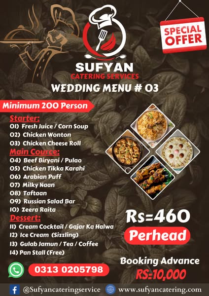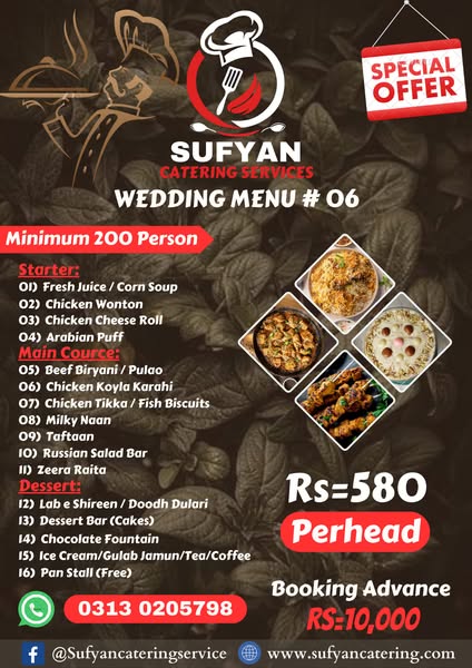 搜索关键词 Sufyan Catering Services, Wedding Food, Karachi Catering, Affordable Wedding, Valima Menu, Event Catering, Delicious Food, Karachi Food Delivery, Best Catering, Wedding Catering Menu优势 New and tasty food menus,Affordable prices,Food tasting available before order,Per head and per KG options available,Service across Karachi