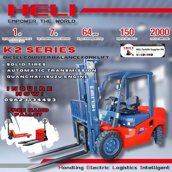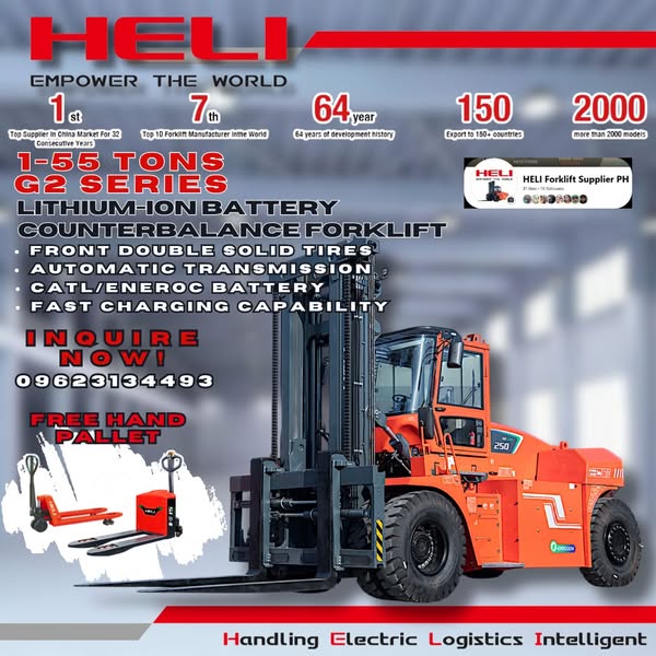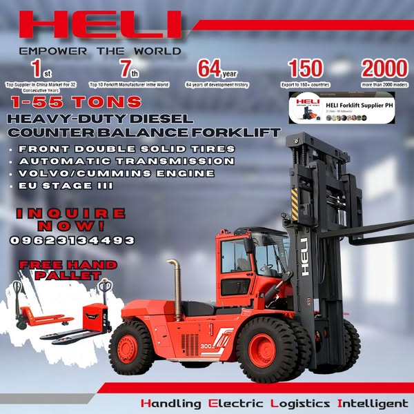 搜索关键词 HELI forklift, diesel forklift, electric forklift, forklift sales, industrial equipment, warehouse equipment, material handling, forklift service, lithium ion forklift, new forklift优势 Wide range of diesel and electric forklifts (1-55 tons),Multiple engine options (Quanchai, Isuzu, Mitsubishi, Volvo, Cummins),Lithium-ion battery options,Guaranteed after-sales service and parts availability,Free delivery, first maintenance materials, hand pallet and basic tool