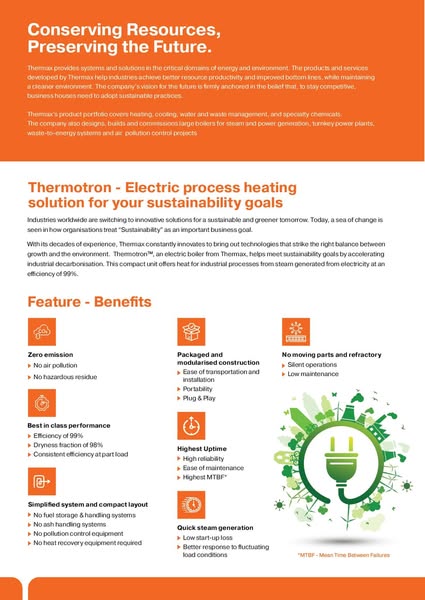 搜索关键词 electric boiler, industrial decarbonization, sustainable energy, green technology, industrial heating, process heating, eco friendly solutions, net zero, energy transition, thermax boiler优势 Eco-friendly,Highly efficient (99%),Sustainable alternative for industrial process heating,Drives industrial decarbonization,Compact design
