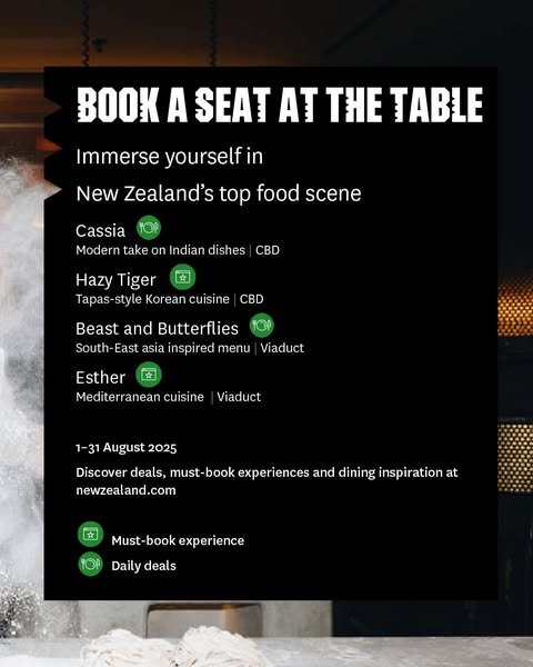 搜索关键词 Auckland restaurants, Restaurant Month, Auckland food deals, Kiwi food scene, global flavors Auckland, August restaurant discounts, Auckland dining experiences, best Auckland restaurants, Auckland foodie deals, NZ Must Do优势 Discounts on global cuisine,Opportunity to explore Auckland's food scene,Promotion of multiple restaurants