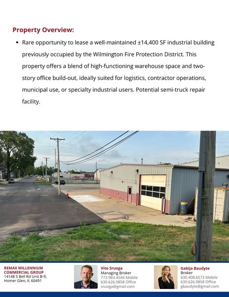 Rare opportunity to lease a ±14,400 SF industrial facility formerly occupied by the Wilmington Fire Protection District. This property offers: