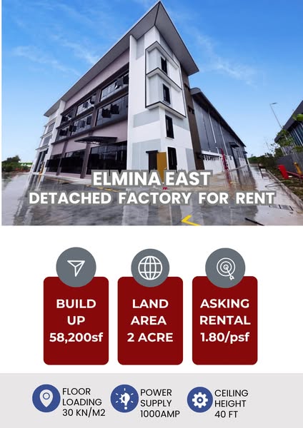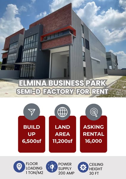 搜索关键词 Elmina Business Park, Factory Rental, Warehouse Sales, Industrial Property Malaysia, Commercial Real Estate Selangor, Sungai Buloh Warehouse, Shah Alam Factory优势 Strategic location in Elmina Business Park,Various unit sizes available,High power supply (200amp),High ceiling height (30ft),Excellent connectivity to major highways,Proximity to key transportation hubs (airport, ECRL, port)