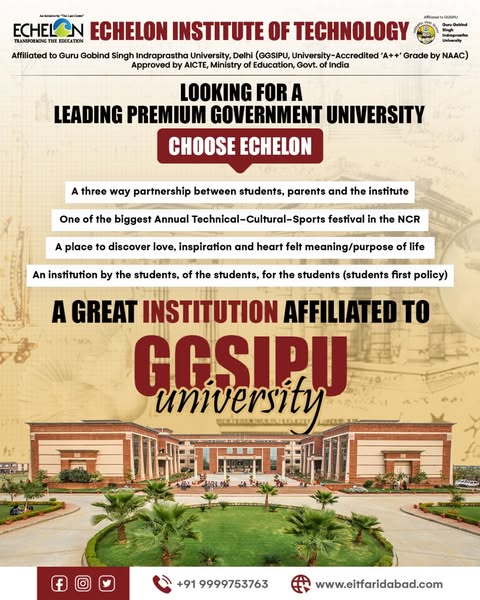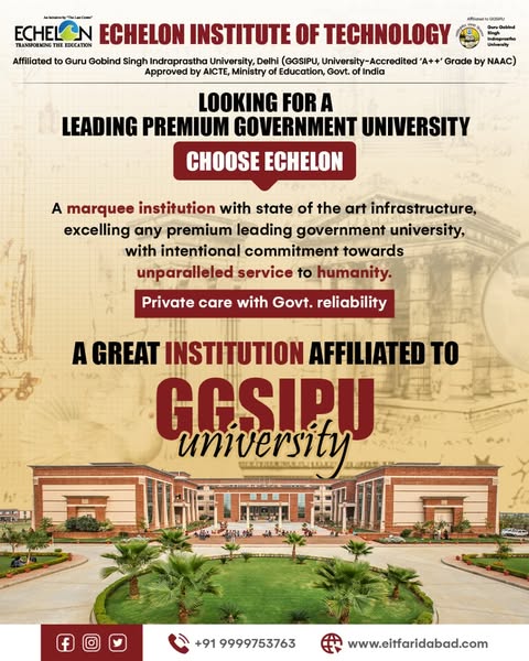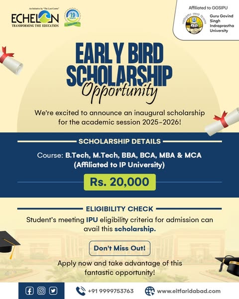 Dreaming of a B.Tech, MBA, or MCA? Echelon Institute of Technology, affiliated with GGSIPU University, is offering an inaugural scholarship for the 2025-2026 academic session! Don't miss this chance to save on your education. Limited spots available!