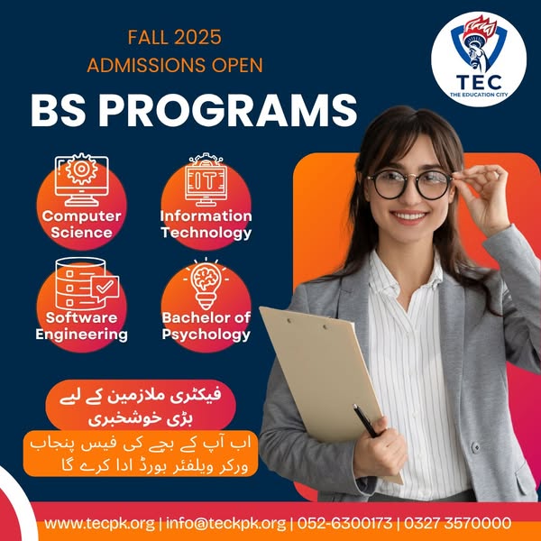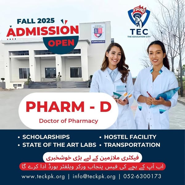 TEC Institute of Medical Sciences is now accepting admissions in highly demanding degree programs for the upcoming academic session. Study in a state-of-the-art campus, with access to qualified faculty, modern labs, and excellent student support services. 🎓 Programs Offered: Doctor of Pharmacy (Pharm. D) Doctor of Physical Therapy (DPT) BS Psychology BS Computer Science (BSCS) BS Information Technology (BSIT) BS Software Engineering (BSSE) ✨ Why Choose TEC? ✅ Scholarships available for eligible students ✅ Modern classrooms & well-equipped labs ✅ Hostel facility for male & female students ✅ Safe and reliable transport service ✅ Career counseling & internship support 📍 Location: Main Sialkot Road, Jessarwala, Tehsil Daska 📞 For admissions & details: 0327-3570000 🖱 Apply online now: