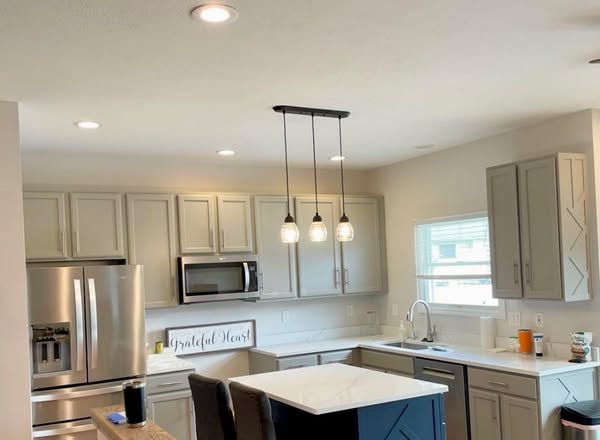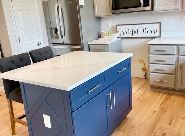 We took this space from golden oak to a stunning two-tone beauty with a custom greige tone on the perimeter cabinets and another custom dark blue island for that perfect pop of contrast.