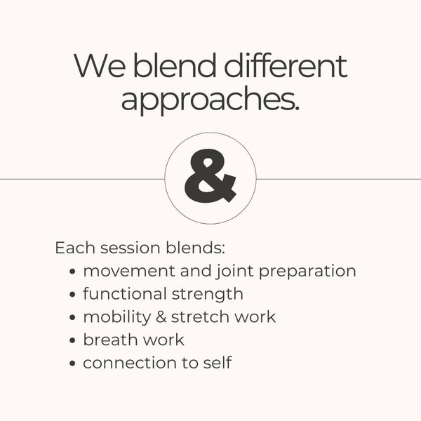 I blend functional strength training, mobility & flexiblity, yoga and breath work, and psychotherapy across all our sessions - and within each session.