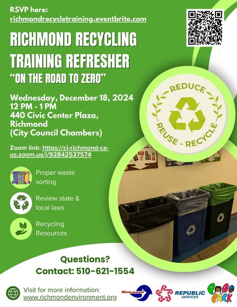 Join the City of Richmond, Republic Services, and Pogo Park this Wednesday, December 18th at Noon in the Richmond City Council Chambers, 440 Civic Center Plaza, to learn about recycling, state and local recycling laws, and free recycling resources. This informational session is open to all ages and is a great opportunity to enhance recycling and sustainability knowledge. Sign up for the event on Eventbrite to secure your spot!