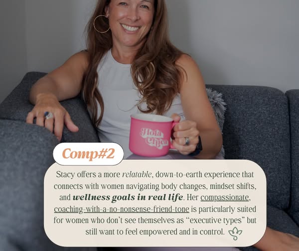 My approach is grounded in real-life habit change, mindset coaching, and sustainable strategies that resonate with women juggling careers, family, and shifting priorities. I offer a relatable, down-to-earth experience that connects deeply with those navigating body changes, emotional eating patterns, and wellness goals in the midst of real life—not just from a clinical or executive lens.