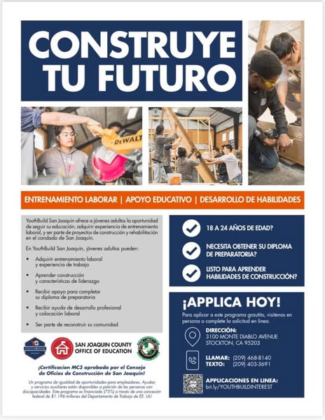 搜索关键词 YouthBuild San Joaquin, construction training, high school diploma, job training, vocational program, career assistance, earn while learn, hands-on skills, industry credentials, Building Futures Academy优势 Hands-on construction training,High School Diploma opportunity,Earn while you learn,Industry-recognized credentials,Career and job placement assistance