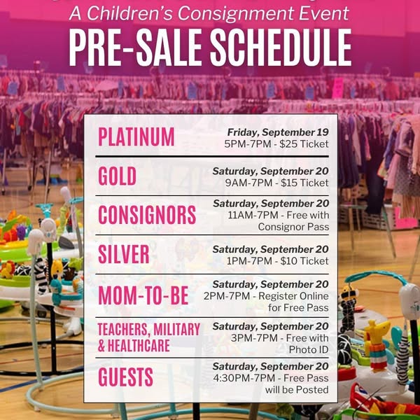 搜索关键词 children's clothes, baby gear, consignment sale, discounted items, pre-sale tickets, family shopping event, second hand clothing, kids shoes, fall winter collection, early access shopping优势 Name-brand items at discounted prices,Early access to deals through pre-sale tickets,Opportunity to shop before the general public,Free passes available,Half-Price Pre-Sale access