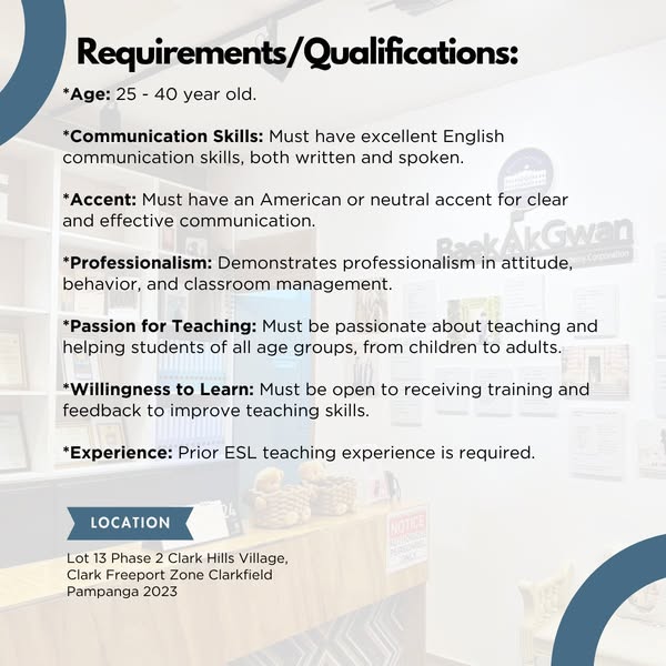 搜索关键词 ESL teachers, English teaching jobs, Teach English Philippines, ESL Philippines, Language school jobs, Clark Philippines, English teacher positions, International teaching, Teach abroad, ESL career优势 Opportunity to inspire students,Help students achieve fluency,International environment