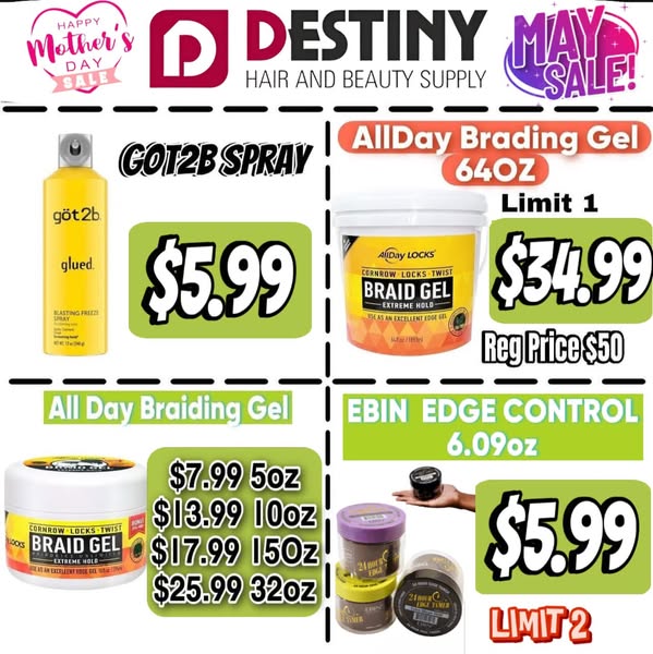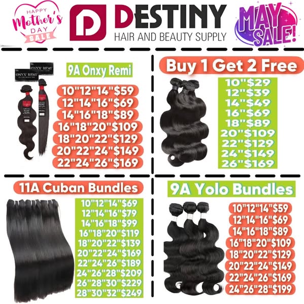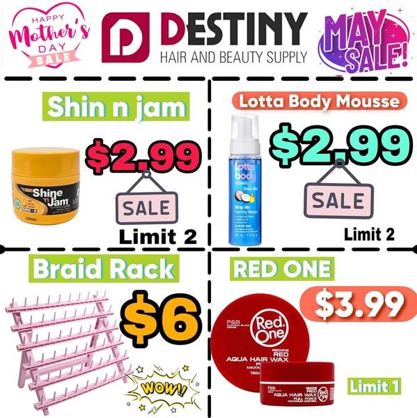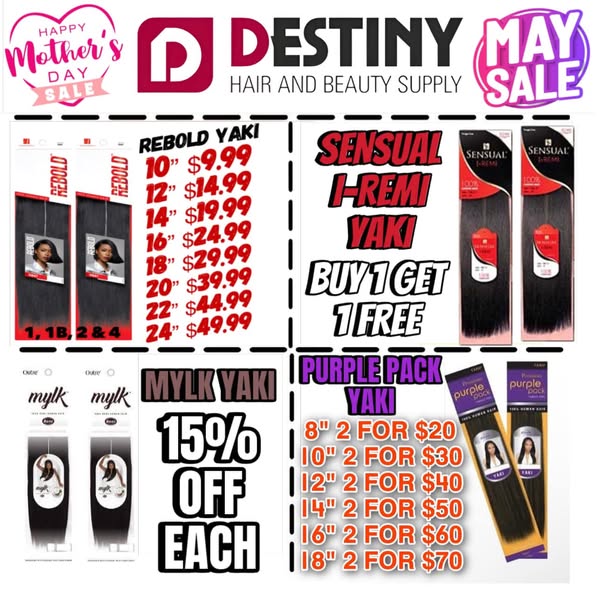 搜索关键词 Mother's Day deals, Beauty supply Buffalo NY, Hair products sale, Destiny Hair Beauty, May promotions, Beauty products giveaway, Buffalo beauty store, Hair extensions deals, Beauty supplies discounts, Local beauty deals优势 Deals for Mother's Day and May,Giveaway promotion,Extended store hours