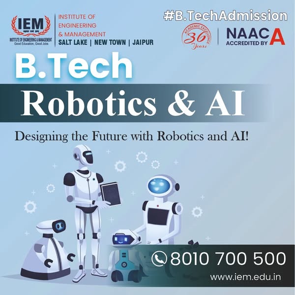 The Institute of Engineering & Management (IEM) offers a B.Tech program in Robotics & AI, equipping students with cutting-edge knowledge in automation, artificial intelligence, and robotic systems. With campuses in Salt Lake, New Town, and Jaipur, IEM has been a hub of academic excellence for 30 years and holds NAAC 'A' accreditation. To embark on a futuristic career, visit