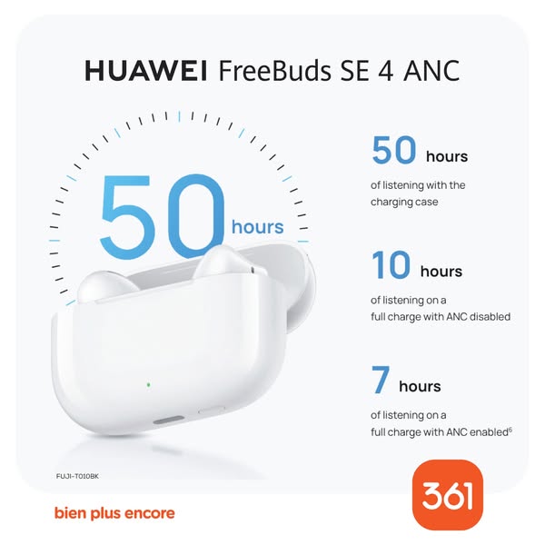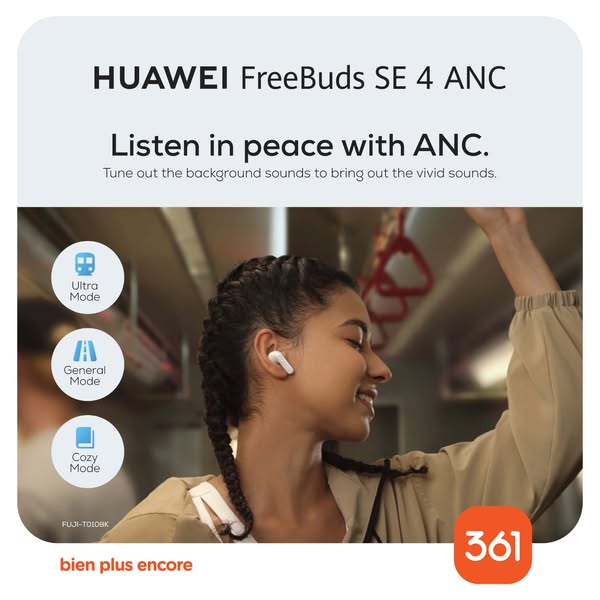 搜索关键词 Huawei FreeBuds, Wireless Earbuds, Noise Cancellation, Mauritius Deals, Affordable Audio, Long Battery Life, 361 Mauritius, FreeBuds SE 4, Music Playback, Audio Comfort优势 50h Music Playback,Multi-Mode ANC (Active Noise Cancellation),Airy-Light Fit,Affordable Price