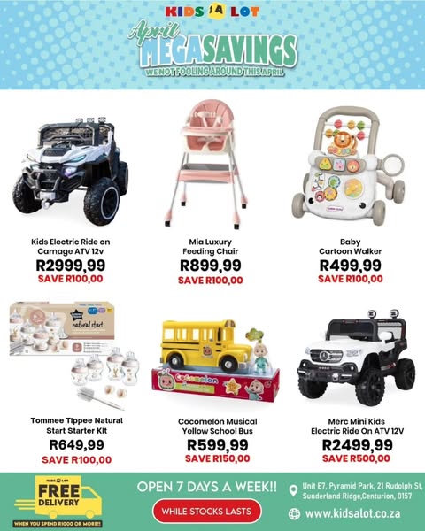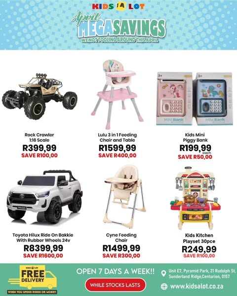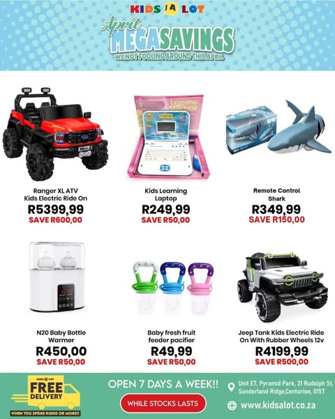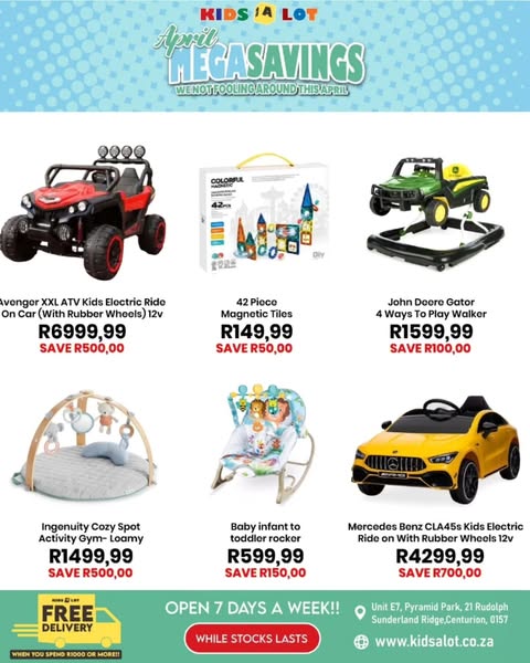 搜索关键词 Kidsalot April sale, baby toys deals, South Africa baby store, free delivery toys, online toys store, baby products online, pay later toys, kids products south africa, kids toys south africa优势 Unbeatable deals in April,Free delivery for orders over R1000,Open 7 days a week,Multiple payment options (Credit/Debit Card, PayFlex, PayJustNow, Bank Deposit/EFT),Countrywide Courier