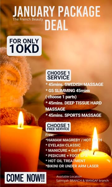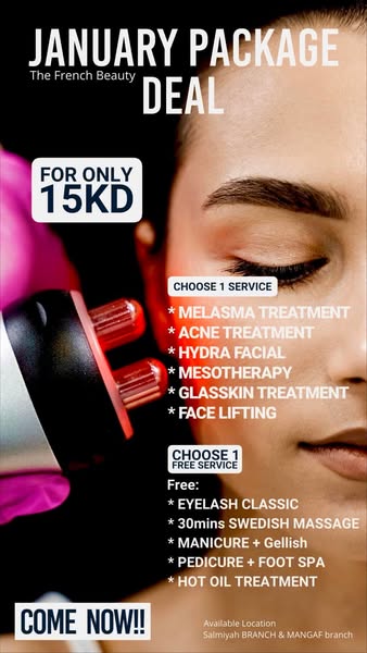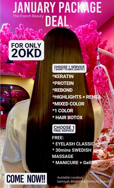 搜索关键词 beauty package, January deals, salon promotion, nail colour, lash extensions, hair treatments, skincare treatments, limited slots, free coupon, beauty services优势 Comprehensive beauty services,Package deal at a great price,Free coupon for next visit