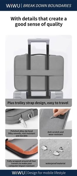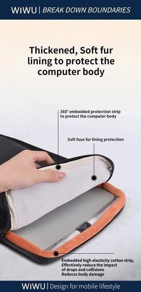 搜索关键词 WiWU laptop bag, waterproof laptop case, cozy classic bag, laptop accessories, hanoi accessories, protective laptop bag, scratch resistant, durable zipper, anti-drop protection, polyester laptop bag优势 Waterproof Polyester 900D Material,Scratch-resistant Faux Fur Lining,Durable and Smooth YKK Zipper,Patent Anti-drop Band