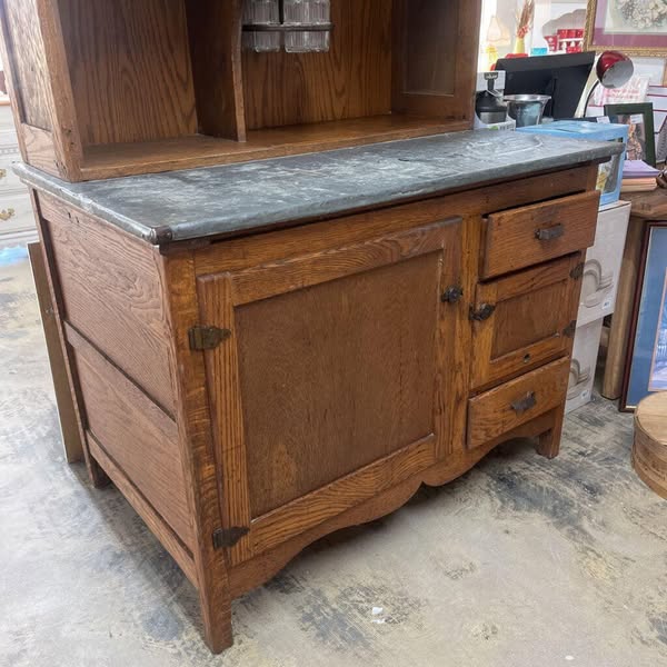 One of its standout features? The original zinc work surface—ideal for rolling dough, prepping meals, or just adding a dash of antique flair to your kitchen. And if you need extra space, you’re in luck: the hutch is fitted with built-in brackets that allow the top to extend outward, giving you even more room to work. It’s clever, classic design at its finest.