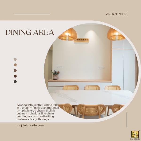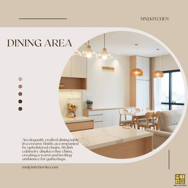𝐃𝐢𝐧𝐢𝐧𝐠 𝐀𝐫𝐞𝐚 𝐂𝐚𝐛𝐢𝐧𝐞𝐭: 𝐴𝑛 𝑒𝑙𝑒𝑔𝑎𝑛𝑡𝑙𝑦 𝑐𝑟𝑎𝑓𝑡𝑒𝑑 𝑑𝑖𝑛𝑖𝑛𝑔 𝑡𝑎𝑏𝑙𝑒 𝑤𝑖𝑡ℎ 𝑎 𝑐𝑟𝑒𝑎𝑚𝑦 𝑓𝑖𝑛𝑖𝑠ℎ, 𝑝𝑎𝑖𝑟𝑒𝑑 𝑤𝑖𝑡ℎ 𝑢𝑝ℎ𝑜𝑙𝑠𝑡𝑒𝑟𝑒𝑑 𝑐ℎ𝑎𝑖𝑟𝑠 𝑎𝑛𝑑 𝑠𝑡𝑦𝑙𝑖𝑠ℎ 𝑐𝑎𝑏𝑖𝑛𝑒𝑡𝑠 𝑡𝑜 𝑑𝑖𝑠𝑝𝑙𝑎𝑦 𝑓𝑖𝑛𝑒 𝑐ℎ𝑖𝑛𝑎, 𝑝𝑒𝑟𝑓𝑒𝑐𝑡 𝑓𝑜𝑟 𝑔𝑎𝑡ℎ𝑒𝑟𝑖𝑛𝑔𝑠.