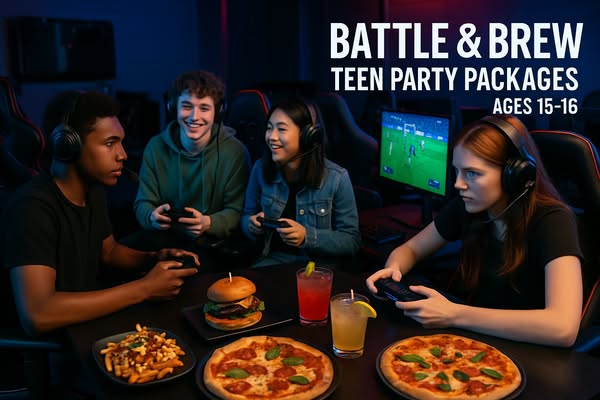 Create unforgettable memories at Battle & Brew, where gaming meets celebration! Our customizable party packages cater to gamers of all skill levels and interests. Choose from our library of popular titles including Fortnite, Mario Kart, FIFA, Marvel Rivals, and more across multiple platforms. With delicious food, specialty drinks, and a vibrant gaming atmosphere, we handle everything so you can focus on what matters—having an epic time with friends. Whether it's a birthday, special occasion, or just because, level up your celebration at Battle & Brew!