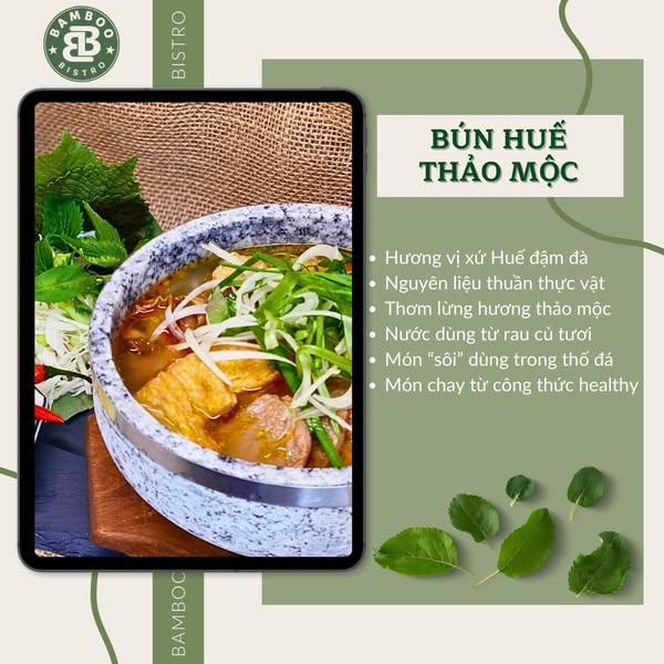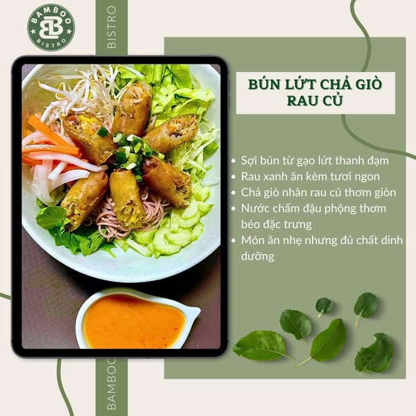 搜索关键词 vegetarian restaurant, healthy food, Bamboo Bistro, vegan cuisine, Vietnamese food优势 Healthy recipes and calculated nutrition,Fresh ingredients and oil-free preparation methods,Unique dining experience engaging all five senses,Diverse menu with various cooking styles