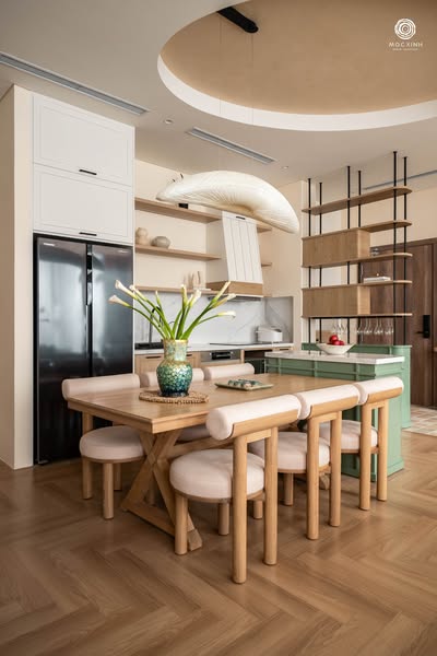Tinh khôi và trong trẻo, căn hộ được thiết kế theo phong cách Modern Rustic tiện nghi gần gũi. Một mái nhà để sống, để sẻ chia và viết nên những ký ức tuổi thơ cho con, nuôi dưỡng sự hồn nhiên thơ bé và tưới tắm chiều sâu tinh thần.
