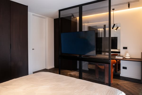 The interior represents an attempt at combining a luxurious living style with pure visible natural materials, but overlaid with a rich dark tone. Almost all interior elements, furniture, wall/floor/ceiling coverings were crafted by local companies with strong cooperation between each other and us, while giving serious attention to detail and remaining faithful to the project. November 2024
