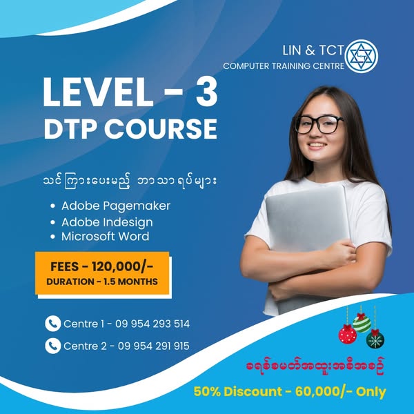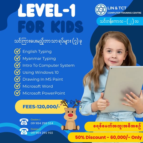搜索关键词 computer training courses, graphic design course, microsoft office course, kids computer courses, 50 discount, Lin and TCT, Kalaymyo Myanmar, DTP course, CorelDraw Logo Design, Microsoft Excel优势 50% Discount on all courses,Wide variety of courses (Normal, Graphic Design, DTP, CorelDraw, Microsoft Office, Kids Courses),Flexible schedule (Enroll now, attend later)