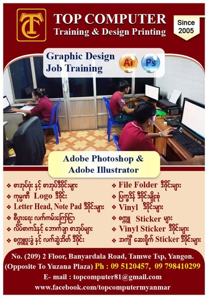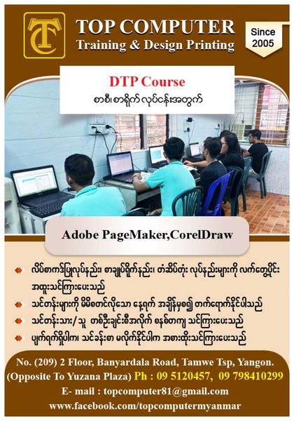 搜索关键词 Computer Training, Basic Course, Myanmar Typing, Microsoft Office, Graphic Design, Adobe Photoshop, DTP Course, Yangon Training Center, Practical Skills, Flexible Schedule优势 Flexible Schedules,Replacement Classes,Practical Training