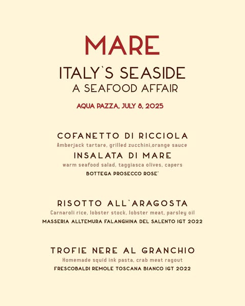 An evening inspired by the flavours of the Italian seaside, from amberjack tartare and squid ink pasta with crab, to our take on the classic Livornese seafood stew, each course will be paired with a regional Italian wine.