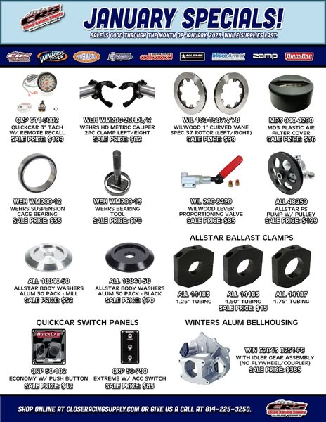 搜索关键词 Closer Racing Supply, Racing Components, January Specials, Automotive Parts, Eldred PA, Online Purchase, Quality Components, Popular Manufacturers, Racing Accessories, Automotive Retail优势 January specials,Online purchase option,Large in-stock inventory,Quality components from popular manufacturers