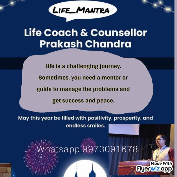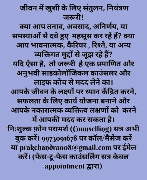 💬 *मुफ़्त* 20 मिनट का फ़ोन काउंसलिंग सत्र प्रकाश चंद्र के साथ - प्रमाणित Psychological Counsellor & Coach Life।