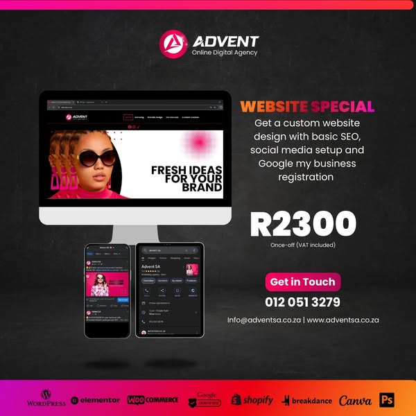 IS YOUR BRAND STANDING OUT? If not, let us create a BOLD identity with a STRIKING logo, SLEEK website, and POWERFUL marketing materials. "YOUR BRAND IS OUR BUSINESS." ELEVATE your brand TODAY! Contact us at 012 051 3279 or info@adventsa.co.za.
